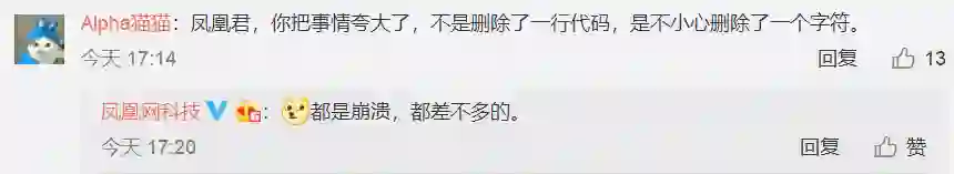 也有网友调侃道:不是删除了一行代码,是不小心删除了一个字符