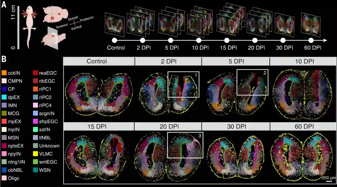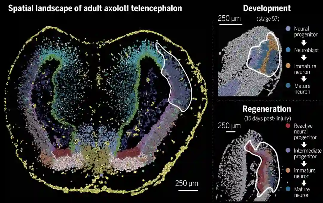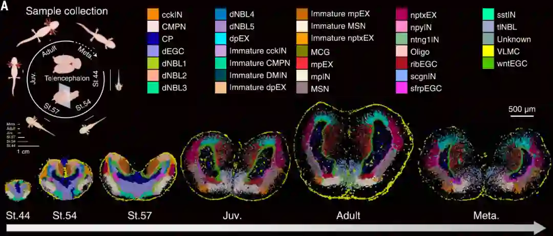 通过使用Stereo-seq,科学家生成了一组端脑切片的空间转录组数据,涵盖了蝾螈的六个发育阶段和七个损伤诱导再生阶段。