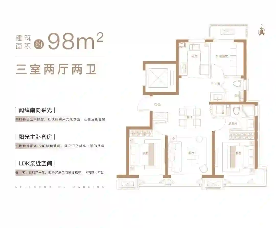 精研是对高审美的精准把握。南向大横厅、三面宽,在98m²至137m²的户型里都被精心纳入设计。137m²的户型南向总面宽高达约11.7米,一天里最好的阳光会透过超大宽幕的玻璃落入房间,窗外的近景是小区园林,远处延展到整个城市的天际线。