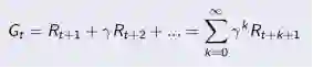 为在一个马尔科夫奖励链上从t时刻开始往后所有的奖励的有衰减的总和。也有翻译成“收益”或"回报"。公式如下: