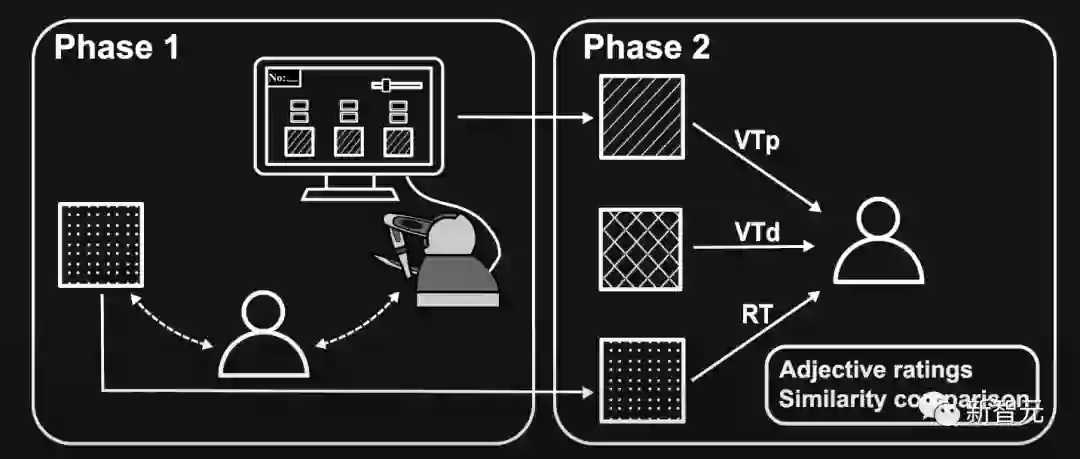 为了模拟真实纹理,研究人员首先会要求用户使用定制工具来触摸真实纹理,然后使用触觉设备触摸一组虚拟纹理候选,其中触觉反馈通过连接到设备触控笔的Haptuator来传输。