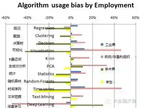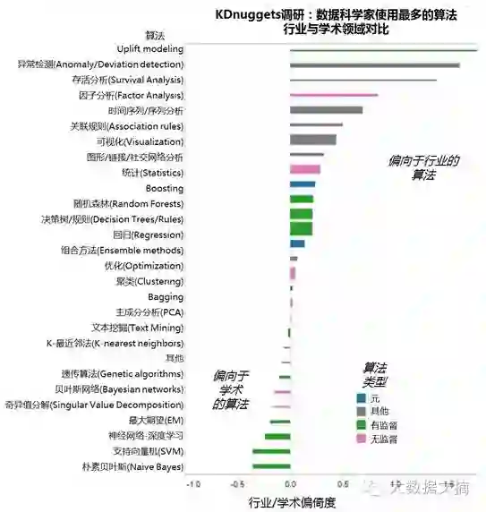 图3:KDnuggets调研:数据科学家使用最多的算法:产业与学术领域对比