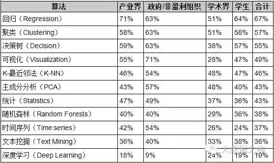 不同职业类型最常用的10大算法+深度学习情况