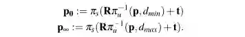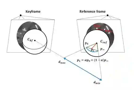 成功跟踪帧后,我们执行立体匹配以细化候选点的逆距离。 当候选点被包括在光度集束调整中时,该估计距离用作初始化。按照一定步长沿着极曲线搜索对应关系。极曲线的数学描述如下: