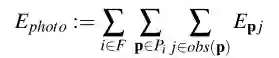 DSO联合优化最近帧窗口内的相机位姿,点的深度和仿射亮度参数。作为直接法,优化目标是光度一致性。DSO也将图像形成过程的光度校准考虑在内。表达两帧之间的光度误差的能量函数如下: