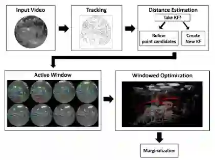 我们提出了一个适用于全景相机的实时的直接单目视觉里程计。我们的方法通过使用统一的全向模型作为投影函数来扩展直接稀疏里程计(DSO),其可以应用于视角(FoV)远大于180度的鱼眼摄像机。这个构思允许我们使用输入图像全部区域的数据,即使具有强烈的失真,而大多数现有的视觉里程计方法只能使用其预处理和裁剪后的部分区域。活跃关键帧窗口内的模型参数被联合优化,包括内在/外在相机参数,点的3D位置和仿射亮度参数。因为拥有更加宽阔的视角,两帧图像的重叠区域变得更大并且点在空间上更加分散。我们的结果表明,我们的方法比起最先进的视觉里程计算法拥有更高的准确性和鲁棒性。
