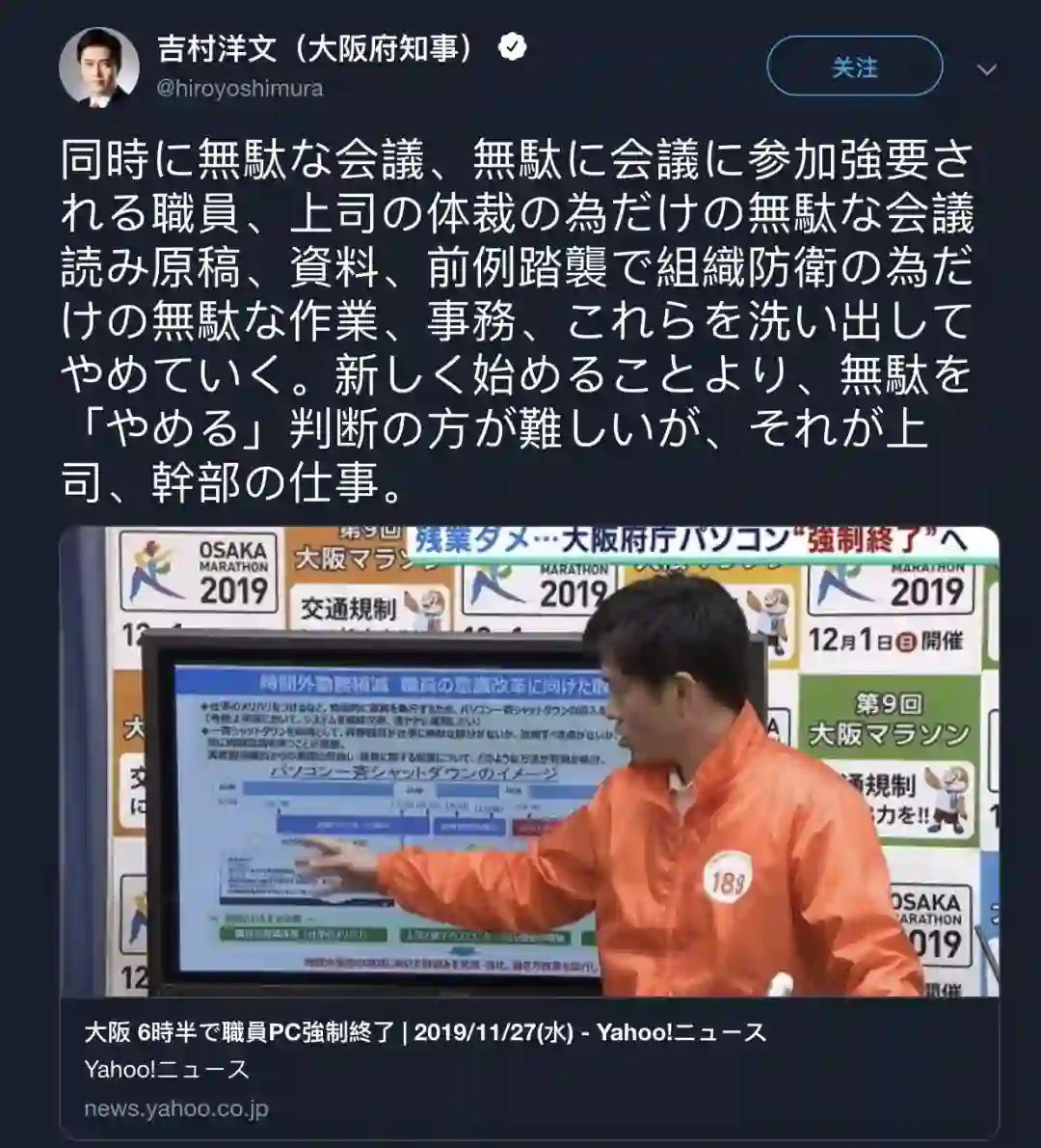 大阪府知事吉村洋文宣布了一项工作改革政策,为减少政府职员加班,将从下午 6 点半后关闭办公电脑。吉村洋文在 27 日下午举行的会议上称,此举旨在提高工作效率,同时提供在紧急情况如自然灾难下关闭工作机器的功能。根据大阪府的统计,2018 年政府职员加班时间超过 100 万小时,加班费约为 30 亿日元。大阪府希望从 2020 年秋冬季开始实施这项新的政策。