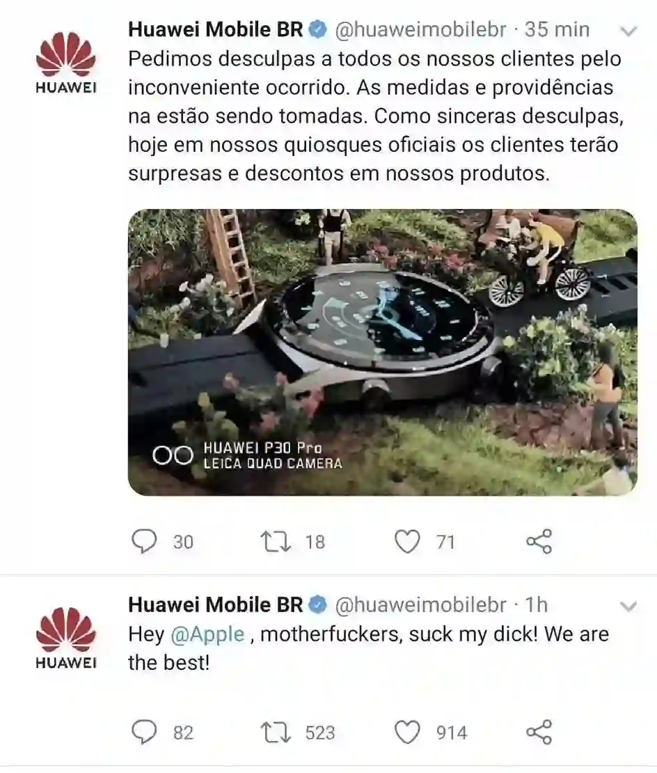 华为巴西的官方社交媒体平台出现攻击苹果公司的内容,对此华为表示,这是官方账号被黑造成的,并不是工作人员发布,在发现后已经第一时间进行了删除处理。这个账号发布的内容多使用葡萄牙语,但是这条攻击苹果的内容使用的却是英语。
