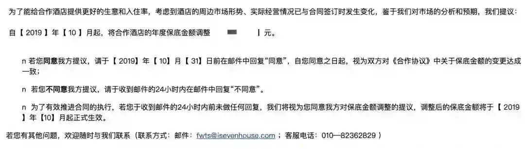 此前,OYO未经与业主商议,修改了与业主们最初签订合同时的保底金额,并邮件通知签约业主改签决定。OYO要求业主在收到邮件的24小时内回复“不同意”,否则就被视为业主同意改签。