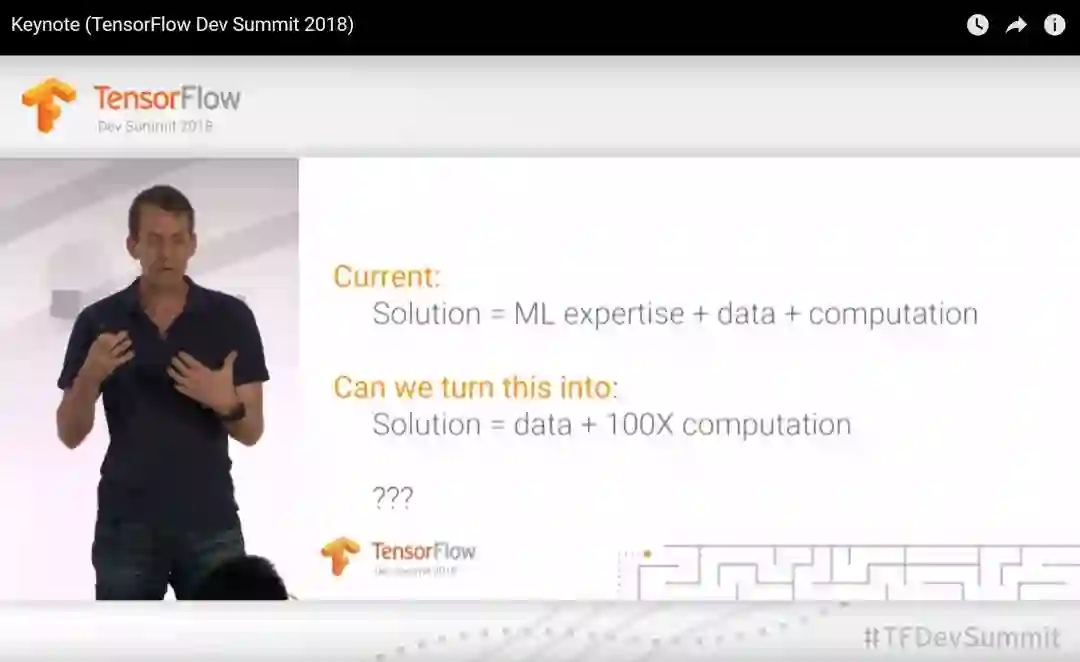 在 2018 年 3 月的 TensorFlow DevSummit 上,Jeff Dean 在他的主题演讲 (https://www.youtube.com/watch?v=kSa3UObNS6o 开始时间在 22:20 左右) 中提出,未来谷歌或许可以用 100 倍的计算能力取代机器学习专业知识。