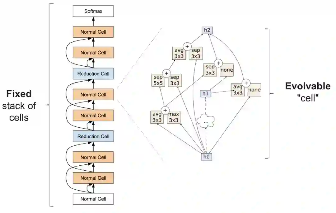 图片由 Zoph 等人于 2017 年所绘,左边是堆叠细胞的完整神经网络,右边是细胞的内部结构