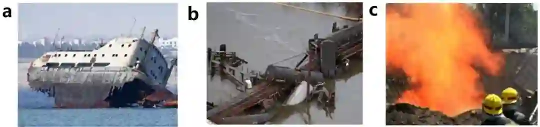 图1 因金属设备腐蚀造成的轮船破沉(a)、桥梁坍塌(b)和管道泄漏(c)事故