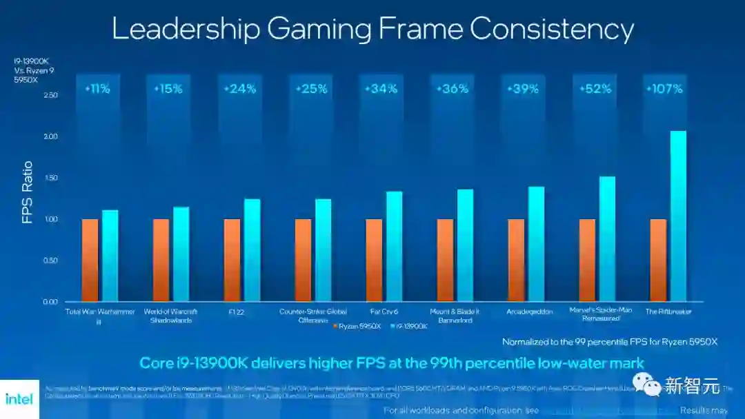 游戏性能方面,英特尔把5000系锐龙旗舰5950X拿出来做了背景板。
