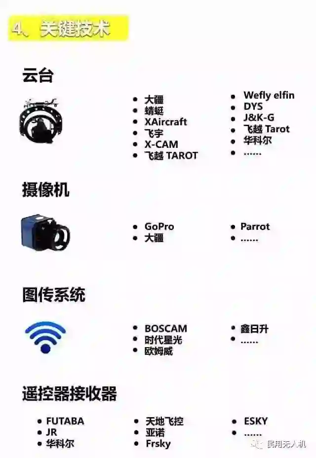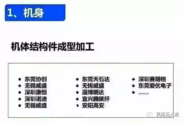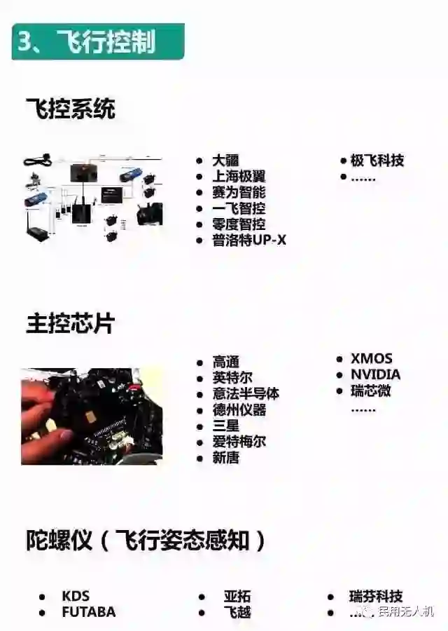 本文综合了无人机供业链各环节所需部件,并将各环节主要供应商列举出来,仅供参考。