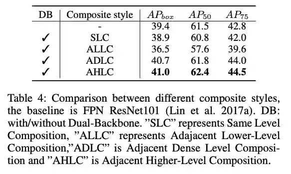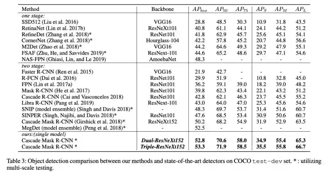 下图为作者在COCO test-dev数据集上的实验,Single代表单模型,DB为对两个骨干网进行合成,TB为三个。