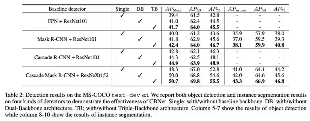可见,CBNet有效改进了目标检测和实例分割的精度。