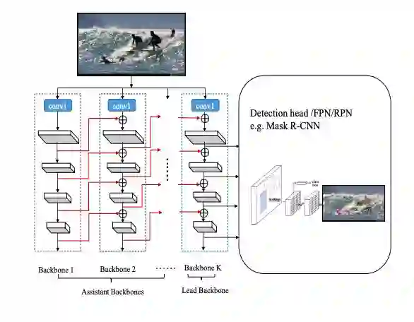 前一个骨干网的结果回传到下一个骨干网相同层之前,使用最后一个Lead Backbone进行检测或分割。K 代表组合骨干网的个数。