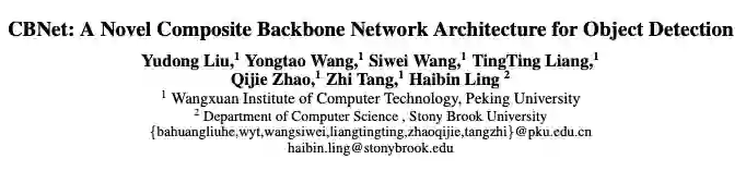 分享一篇前几天新出的论文CBNet: A Novel Composite Backbone Network Architecture for Object Detection,文中提出一种新型特征融合算法,有效提升了目标检测和实例分割精度,CBNet配以Cascade RCNN取得了COCO 数据集 mAP 53.3 的新高度!