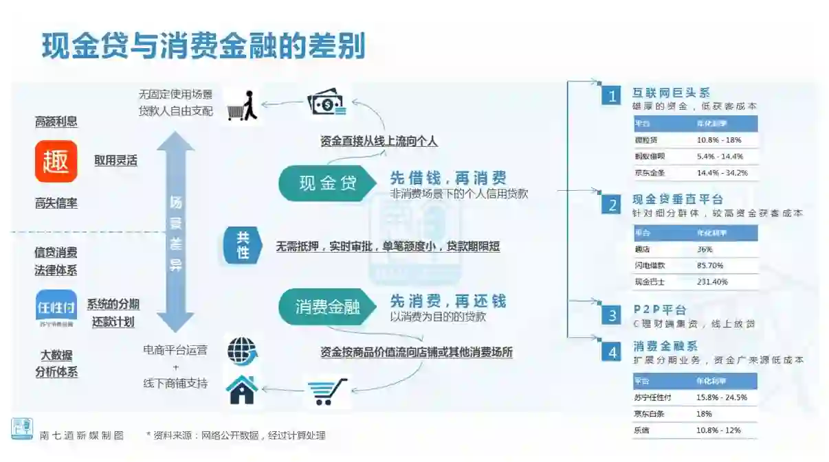目前小额的借款主要是包括现金贷和消费贷两种。消费贷的借款用途,就是直接用于消费购物,资金直接打给商品的销售方,而不会给到贷款者;现金贷则是直接打给借款人,没有具体的消费场景,钱具体干什么去了谁都不知道。