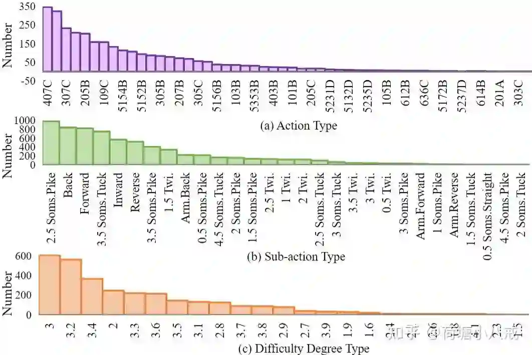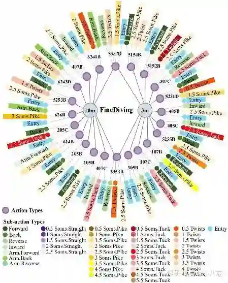 FineDiving数据集包含3000个样本,涵盖52种action types、29种sub-action types以及23种难度难度系数,如图(4)所示。
