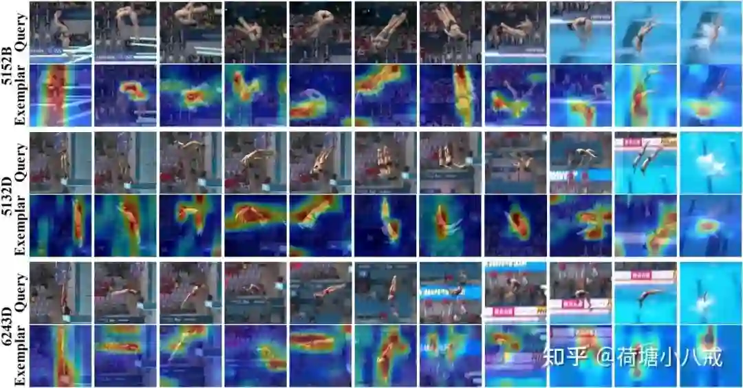 我们进一步提出一种过程感知方法来评估动作质量,通过构建一个新的时间分割注意模块(Temporal Segmentation Attention,TSA),以可解释的方式评估动作得分。TSA包含三个部分:动作过程分割(procedure segmentation),过程感知交叉注意(procedure-aware cross-attention)以及细粒度对比回归(fine-grained contrastive regression)。首先,动作过程分割将成对的查询动作实例和参考动作实例解析为语义和时间对齐的连续步骤。其次,过程感知交叉注意通过学习发现成对query step和exemplar step之间的时空对应关系,并在这两个步骤中生成新特征。成对的步骤相互补充,以引导模型关注exemplar step和query step中的一致区域,其中,exemplar step保留了特征图的空间信息。最后,细粒度对比回归通过学习成对步骤的相对分数来量化查询动作实例和示例动作实例之间的一些列步骤偏差,以指导模型来评估动作质量。