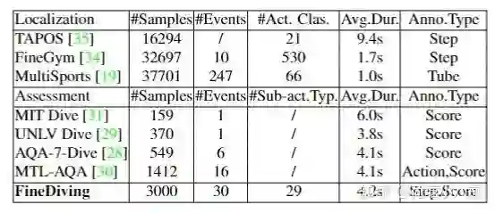 根据表(5)可知,FineDiving在注释类型和数据规模上不同于现有的AQA数据集:MIT-Dive、UNLV以及AQA-7-Dive数据集仅提供动作分数,MTL-AQA提供粗粒度注释(即动作类型和时间边界),而FineDiving提供了细粒度注释(包括动作类型、子动作类型、粗粒度和细粒度时间边界以及动作分数)。此外,由于缺乏动作得分,其他细粒度的运动数据集不能用于评估动作质量。不难发现,FineDiving作为第一个用于AQA任务的细粒度运动视频数据集,填补了AQA中细粒度注释的空白。