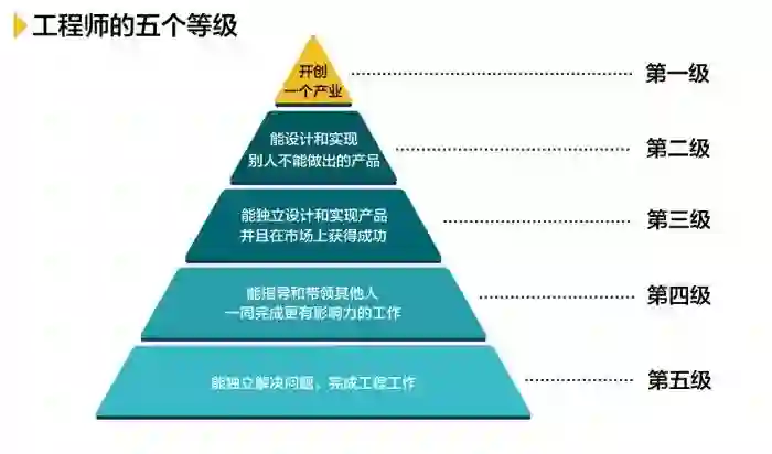 著名前苏联物理学家朗道(https://zh.wikipedia.org/wiki/朗道)曾经给出过一个五级物理学家的划分,吴军老师在此基础上,给出了“五级工程师”的划分,如下图: