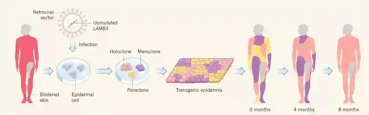 面对上述这名7岁患者,意大利摩德纳雷焦艾米利亚大学的Michele De Luca及同事利用其身体上无大疱区域的皮肤细胞,培养了原代角化细胞,并利用逆转录病毒载体对其进行基因改造以抑制LAMB3基因的非突变形式,借此重建表皮。 之后,转基因表皮移植物被敷在准备好的真皮创伤部位,覆盖患者受到影响的体表。