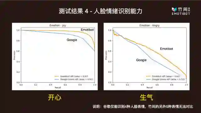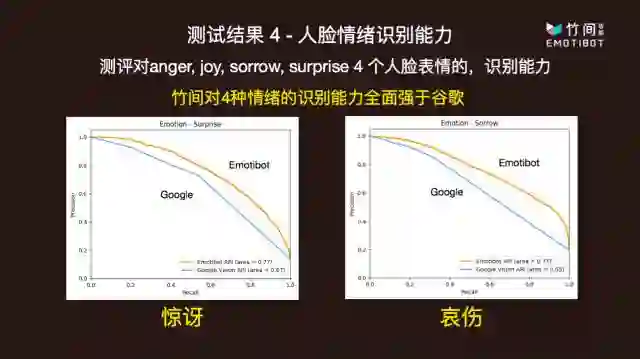 竹间智能以香港中文大学发布的 Expression in- the-Wild (ExpW) Dataset 作为测试集,将自己的情绪识别 API Emoti-Face 与谷歌云提供的也有情绪识别功能的 Google cloud vision API 进行了对比,并在共有的开心、生气、哀伤和惊讶四个维度上,取得了优异于谷歌的准确率和识别能力。