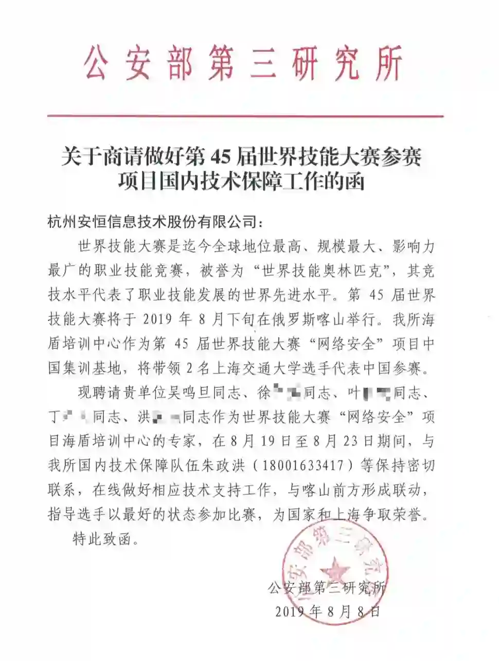 安恒信息网络空间安全学院副院长吴鸣旦等受邀出任世界技能大赛“网络安全”项目集训主基地公安部第三研究所下属上海海盾安全技术培训中心聘请的技术专家。
