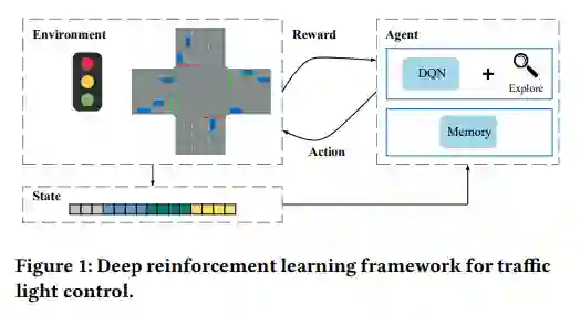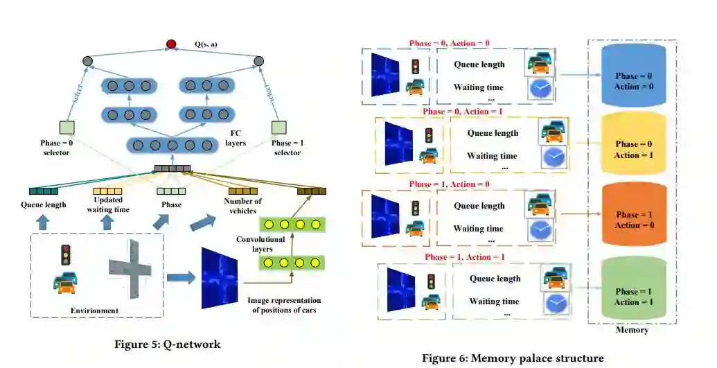 作者在现有研究方法的基础上提出了使用深度强化学习解决交通控制的方法,整体结构图如下:从图中可以看出右侧使我们熟悉的强化学习的模型结构。在此基础上定义了一些交通控制中的参数