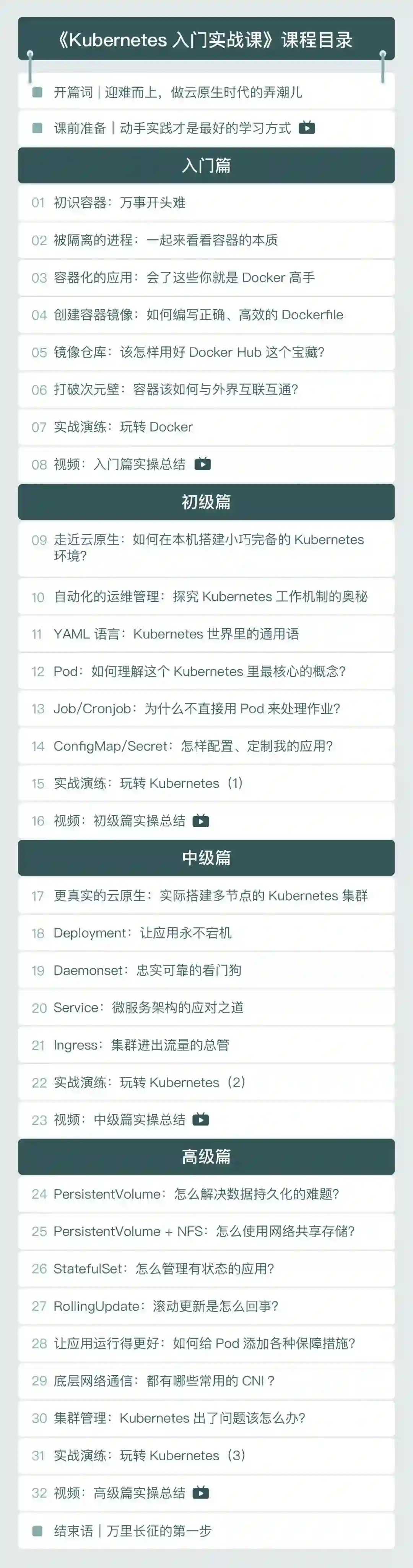 此张图出自老朋友「极客时间」,他们最近出了个新专栏——《Kubernetes 入门实战课》,早在打磨阶段我就参与了调研。最大感触就是——完全按照程序员的学习痛点来设计:
