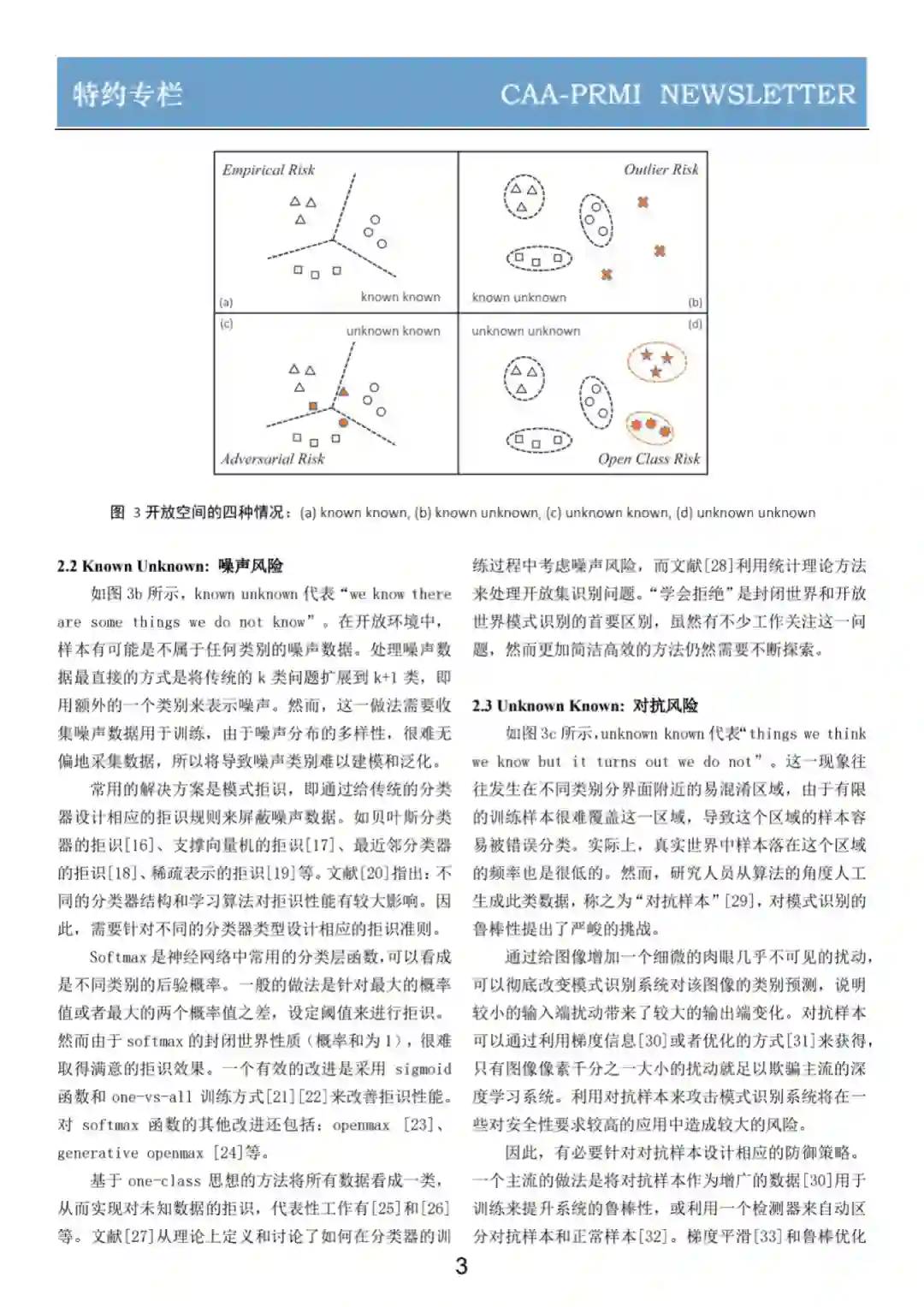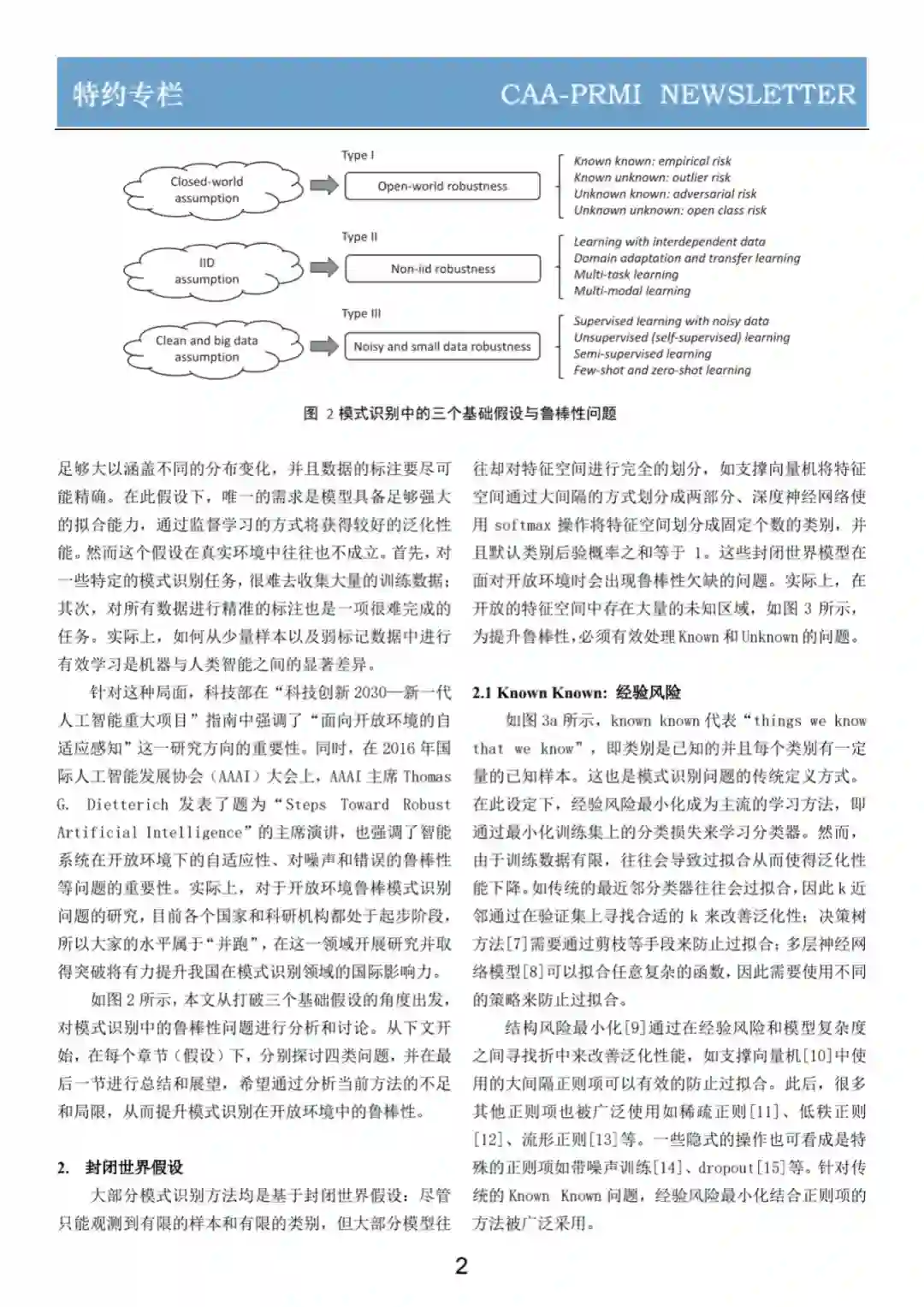 目前诸多模式识别任务的识别精度获得不断提升,在一些任务上甚至超越了人的水平。单从识别精度的角度来看,模式识别似乎已经是一个被解决了的问题。然而,高精度的模式识别系统在实际应用中依旧会出现不稳定和不可靠的现象。因此,开放环境下的鲁棒性成为制约模式识别技术发展的新瓶颈。实际上,在大部分模式识别模型和算法背后蕴含着三个基础假设:封闭世界假设、独立同分布假设、以及大数据假设。这三个假设直接或间接影响了模式识别系统的鲁棒性,并且是造成机器智能和人类智能之间差异的主要原因。本文简要论述如何通过打破三个基础假设来提升模式识别系统的鲁棒性。