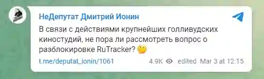 前俄罗斯杜马副主席、斯维尔德洛夫斯克州副州长 Dmitry Ionin 表示:“考虑到好莱坞最大电影制片厂的活动(宣布抵制俄罗斯),现在岂不正好可以解封 RuTracker 了吗?🤔”