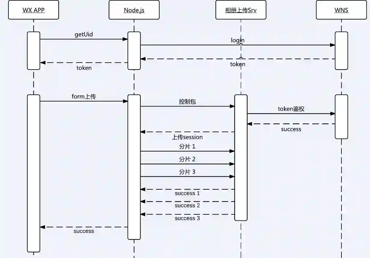 而后者则是尽量同步,接收到图片 / 视频 part 我们就可以开始上传,只是没有刚好满足我们需求的组件来支持。基于以上对比我们选择后面的方案,自己来解析 Form 上传表单,整个上传流程可以看下面的时序图。