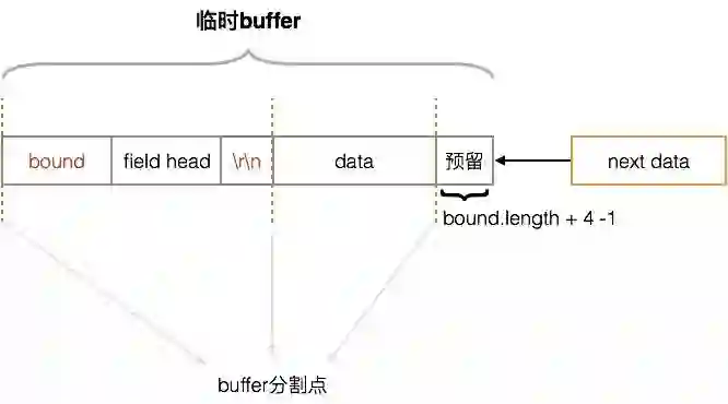 虽然没有查找到这两种分隔符,但是有可能当前 buffer 的结尾已经包含了部分分隔符的内容,所以我们需要预留出一部分 buffer,这段 buffer 前面的部分认为是文件内容是安全的,这段 buffer 只能等与后续收到的 data 拼接在一起才知道是不是文件内容。因为预留的这段 buffer 的目的是为了防止将分隔符当做文件内容传输了,所以预留的这段 buffer 长度应该不短于 buffer 长度减一,即 buffer 的长度为bound.length + 4 - 1,4 代表 4 个-长度。