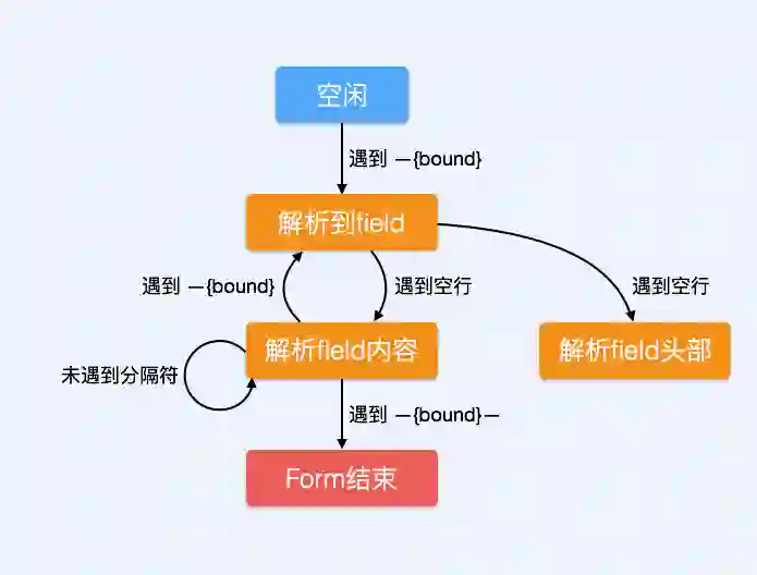 Form 表单是流式的,表单 field 的查找其实是线性的,且是有状态的,整个解析过程我们可以看成是一个有限状态机,而 Form 请求的 data 事件则是这个状态机的驱动器。