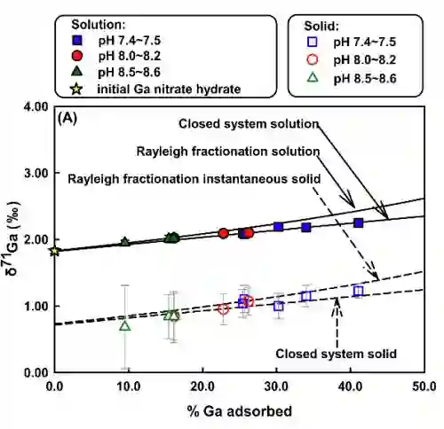 吸附过程对于充分了解金属离子在水岩作用、生物吸收以及大陆风化作用中的迁移转化及机理起着至关重要的作用。Mo、Ge 和 Zn 等多种金属已被证明在矿物吸附过程中会产生显著的同位素分馏。据此,中国科学院地球化学研究所研究员陈玖斌课题组利用在2016年新建的高精度 Ga 同位素分析方法的基础上,开展了 Ga 在矿物表面吸附过程中的同位素分馏研究。研究选取作为地球表层普遍存在并是微量元素迁移的重要载体方解石和针铁矿两类矿物。结果表明,较轻的 Ga 同位素(69Ga)会被优先吸附到矿物(方解石和针铁矿)表面,且方解石表面吸附过程中的同位素分馏大于针铁矿表面吸附过程,其 △71Gasolid-solution 分别为-1.27‰和-0.89‰。造成分馏的主要原因是 Ga 从水溶液吸附到矿物表面发生了形态转变(共价键数和键长),水体中 Ga(OH)4– 会优先吸附到方解石和针铁矿表面分别形成 >Ca-O-GaOH(OH2)4+ 和 >FeOGa(OH) 20 ,从而使共价键由4转变为6,且 Ga-O 键长变长,分别从水体中的1.84 Å 增加到1.94 Å 与1.96 Å 。研究结果表明,有机物吸附过程也会产生类似的 Ga 同位素分馏,预示着 Ga 同位素可以用于示踪生物地球化学过程。特别是在低比值的水/碳酸盐岩与水/铁(氢)氧化物的表层环境下,水体较颗粒物而言可能富集重的 Ga 同位素(71Ga)。作为新开发的同位素体系, Ga 在地学各领域研究中有着重要应用前景。
