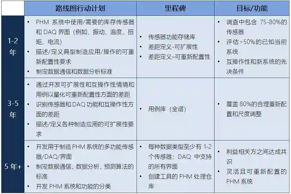 根据以上被确定的最为重要的挑战和期望的能力,优先制定了三种路线图以支持PHM制造工艺技术和指标,同时有助于将PHM的发展集成到智能制造的流程中。