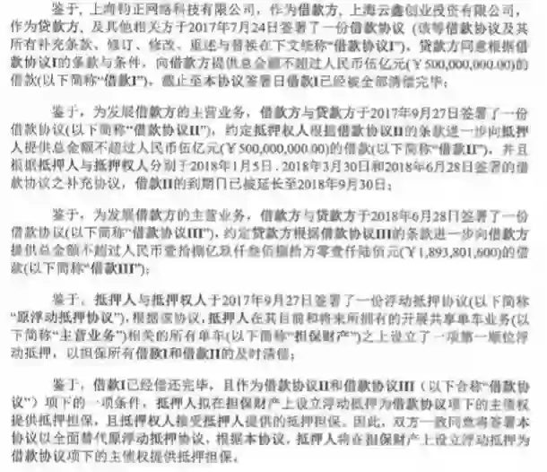 根据浮动抵押协议,为了发展单车主营业务,上海钧正曾于2017年7月、2017年9月和2018年6月向上海云鑫28亿元,三笔分别为5亿、5亿、18亿,第一项5亿借款已经全部还清,双方再次签署的浮动抵押协议借款金额不超过23亿(5+18),其中主合同金额为5亿。