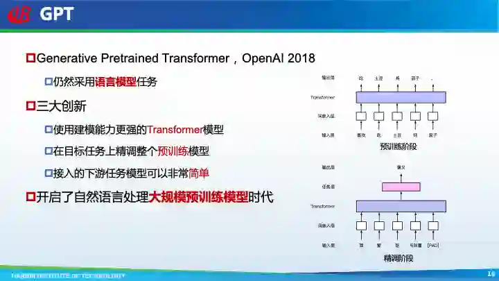 然而,好景不长,ELMo提出不久,OpenAI便提出了第一代GPT(Generative Pretrained Transformer)模型,正式将自然语言处理带入到“预训练”时代。和ELMo一样,GPT也是使用语言模型任务作为预训练任务,不过GPT模型有三大创新:首先,它使用了性能更强大的Transformer模型;其次,它提出在目标任务上精调整个模型,而不是只将模型的输出结果作为固定的词向量特征;最后,由于预训练模型自身足够复杂,所以接入的下游任务模型可以非常简单,这极大降低了自然语言处理的门槛。