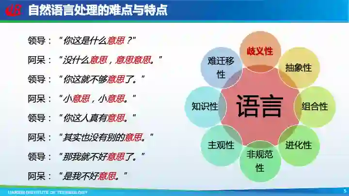 那么,自然语言处理到底难在哪呢?我们通过一个例子来看一下,这是领导和阿呆的对话,其中有很多的“意思”,它们又有很多不同的意思。这体现了自然语言具有非常严重的歧义性的特点,除了歧义性外,自然语言还具有抽象性、组合性、进化性、非规范性等八个主要特点。