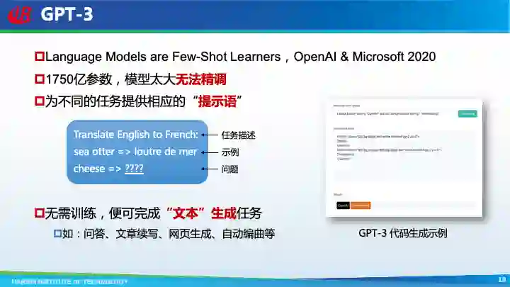 后来,微软痛定思痛,建造了自己的超大规模人工智能计算平台,并同OpenAI联合训练了GPT-3模型。和前两代GPT模型相比,GTP-3在模型结构上并没有太大的变化,不过它含有1750亿超大规模参数,由于模型参数太大,以致于无法再对它进行精调的操作了。为了适应于不同的任务,需要针对不同任务提供相应的“提示语”,如:只输入任务描述“Translate English to French:”以及具体的问题,“cheese => ”,那么GPT-3就能够直接输出翻译的结果;如果在输入任务描述之后再给一个或几个示例,那么任务完成的效果会更好。GPT-3更惊艳的是能够无需针对下游任务进行训练,便可以完成各种”文本“生成任务,这里面的”文本“是打引号的,也就是说不但能够生成纯文本,还能生成网页、乐谱甚至程序代码等。有人说GPT-3更像是一种通用的人工智能,因为它能够完成各种非预先设定的任务。