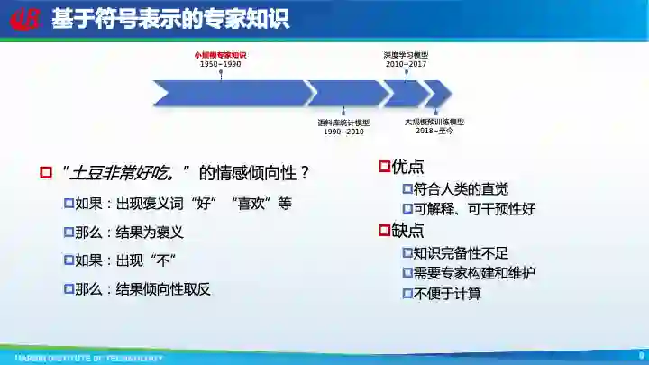 自然语言处理发展的前40年,利用的是基于符号表示的小规模专家知识,也就是通过人工定义的规则以及语言知识库,来解决一些简单的自然语言处理问题。这种方法的优点是符合人类的直觉,并且具有良好的可解释和可干预性。但是缺点也非常明显,首先是知识完备性不足,无法覆盖很多的长尾语言现象;其次是需要大量的专家来构建和维护规则和知识库;最后就是非常不便于计算。