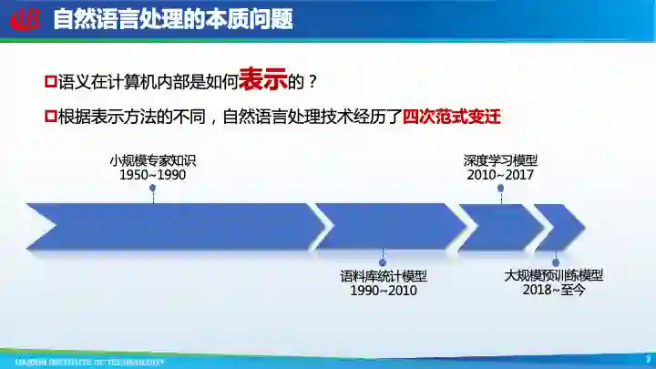 经过60余年的发展,人们已经研发了各种各样自然语言处理技术,这些纷繁复杂的技术本质上都是在试图回答一个问题:语义在计算机内部是如何表示的?根据表示方法的不同,自然语言处理技术共经历了四次范式变迁。
