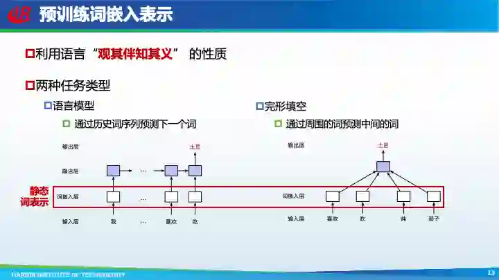 人们最开始只想到对词嵌入进行预训练,其思想是利用语言存在“观其伴知其义”的性质,自然构成一个“下游任务”。具体的任务可以分为两类:第一类是通过历史词序列,预测下一个词,这又被称作”语言模型“任务;另一类是利用周围的词预测中间的词,这类似于”完形填空“任务。这样,各种电子文档、图书乃至整个互联网上的文本数据,都可以作为训练数据,从而极大增强了词嵌入表示的学习能力。