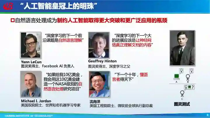 以上这些难点和特点为自然语言处理带来了极大的挑战,并使自然语言处理成为目前制约人工智能取得更大突破和更广泛应用的瓶颈之一。包括多位图灵奖得主在内的多位知名学者都表示了对自然语言处理的极大关注。甚至图灵本人,也将验证机器是否具有智能的手段—“图灵测试”,设定为通过自然语言进行人机对话的场景。因此,自然语言处理也被誉为“人工智能皇冠上的明珠”。