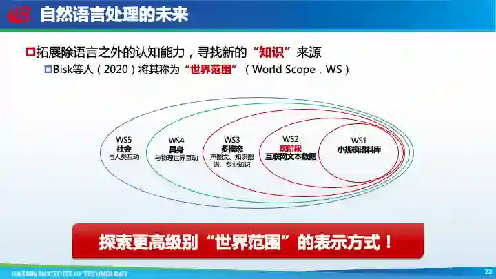 为了未来真正实现自然语言处理,一定要拓展除语言之外的认知能力,寻找新的“知识”来源。Bisk等人(2020)将其称为“世界范围”(World Scope,WS),并划分了五个级别。