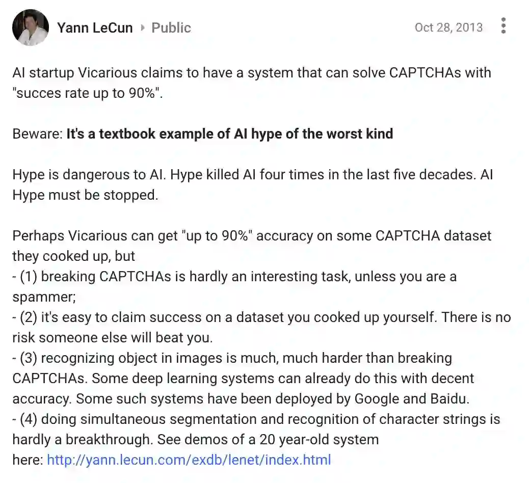 当 2013 年 Vicarious AI 公布结果时,业界褒贬不一,Vicarious AI 没有拿出有效的研究方法是很多 A.I. 科学家口诛笔伐的主要理由,其中也包括了 LeCun。他在 2013 年对 Vicarious AI 进行了激烈的抨击,并用「这是最糟糕的教科书式的 AI 炒作案例(It is a text example of AI hype of the worst kind)」来谴责 Vicarious AI。