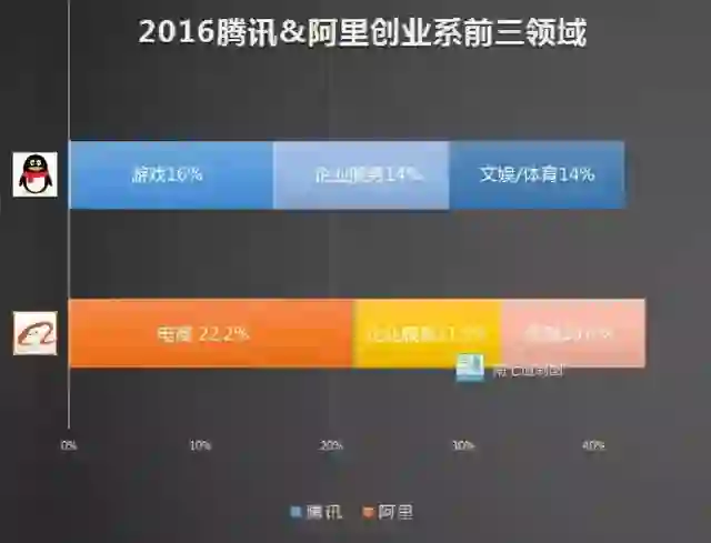 金融成为共同热门领域:根据南极圈提供的数据,其收录统计的233个腾讯系创业中,创业涉及的领域比较广泛,但主要是集中在游戏(16%)、企业服务(14%)、文娱/体育(14%)、互联网金融(12%),有个特别要注意的数据是,社交独霸天下的腾讯,它的离职员工在这个领域的创业者只占3%,一是面临着腾讯QQ、微信强大的社交攻势和压力,另外一个就是社交离钱太远了。要做大很难。而根据阿里创业组织前橙会提供的资料,阿里系创业前三领域分别是电商(22.2%)、企业服务(11.5%)、金融(10.6%)。